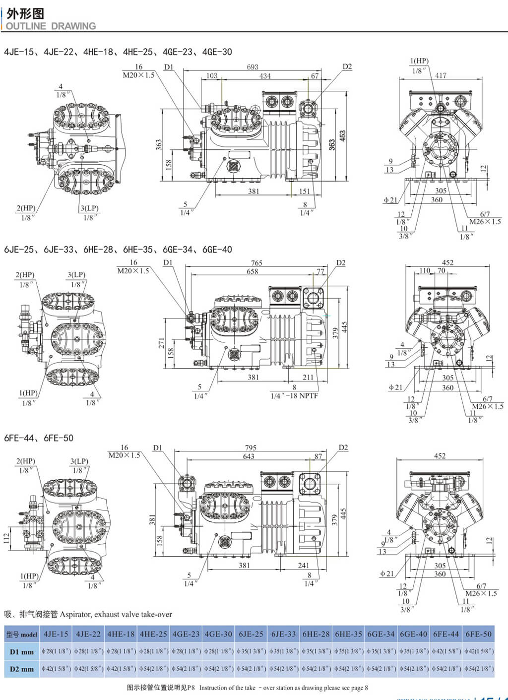 15.喷液口(不带液体过冷器。热力即胀阀运行) 16.油压差开关"Dlta-P"连接 17.液体过冷器制冷剂入口 18、液体过冷器制冷剂出口 19.热力膨胀资外平衡管接口(带液体过冷器运行) DI.排气阀接口 D2、吸气阅接口 |